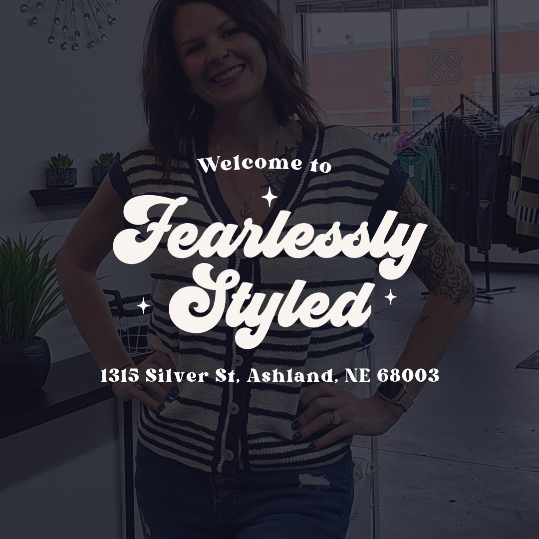 Hi, I’m Darcy! Wife to Shane, mom and bonus mom to 6 amazing kids, and the heart behind Fearlessly Styled. I opened our Ashland, NE storefront in July 2024 to create a stylehouse where women can shop without rules, embrace their unique style, and feel confident in who they are. We’re open select hours in-store, online 24/7, and share space with Luminous Esthetics by Karley, so you can shop and treat yourself in one stop.