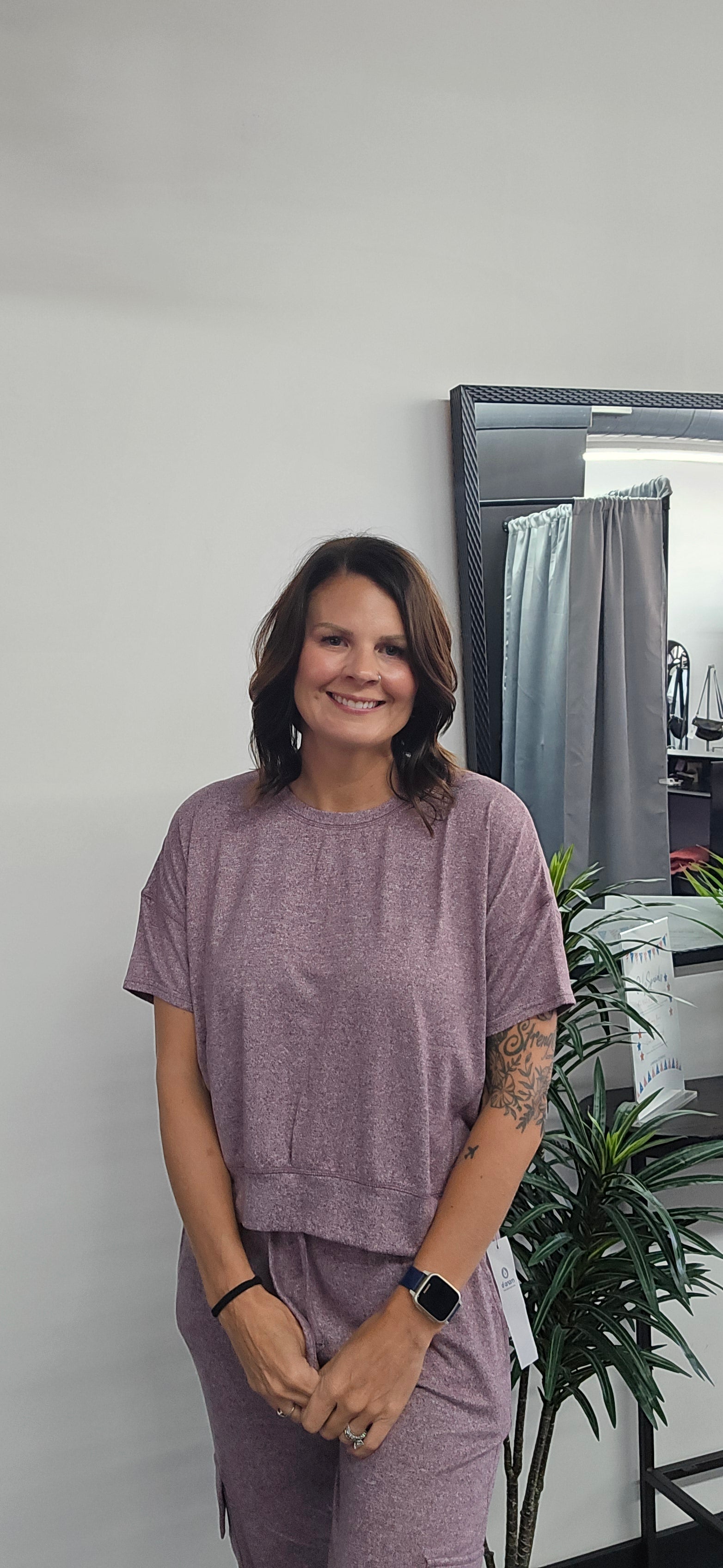 Relaxation has never looked or felt this good. Crafted from brushed Hacci fabric that’s soft as a cloud, this crewneck short-sleeve top effortlessly transitions from sleep to lounge to lifestyle. The dolman sleeves provide a relaxed fit with plenty of arm mobility, while side slits add ease and freedom of movement. Perfectly versatile, it pairs beautifully with your favorite Hacci pants for a cozy, coordinated look.