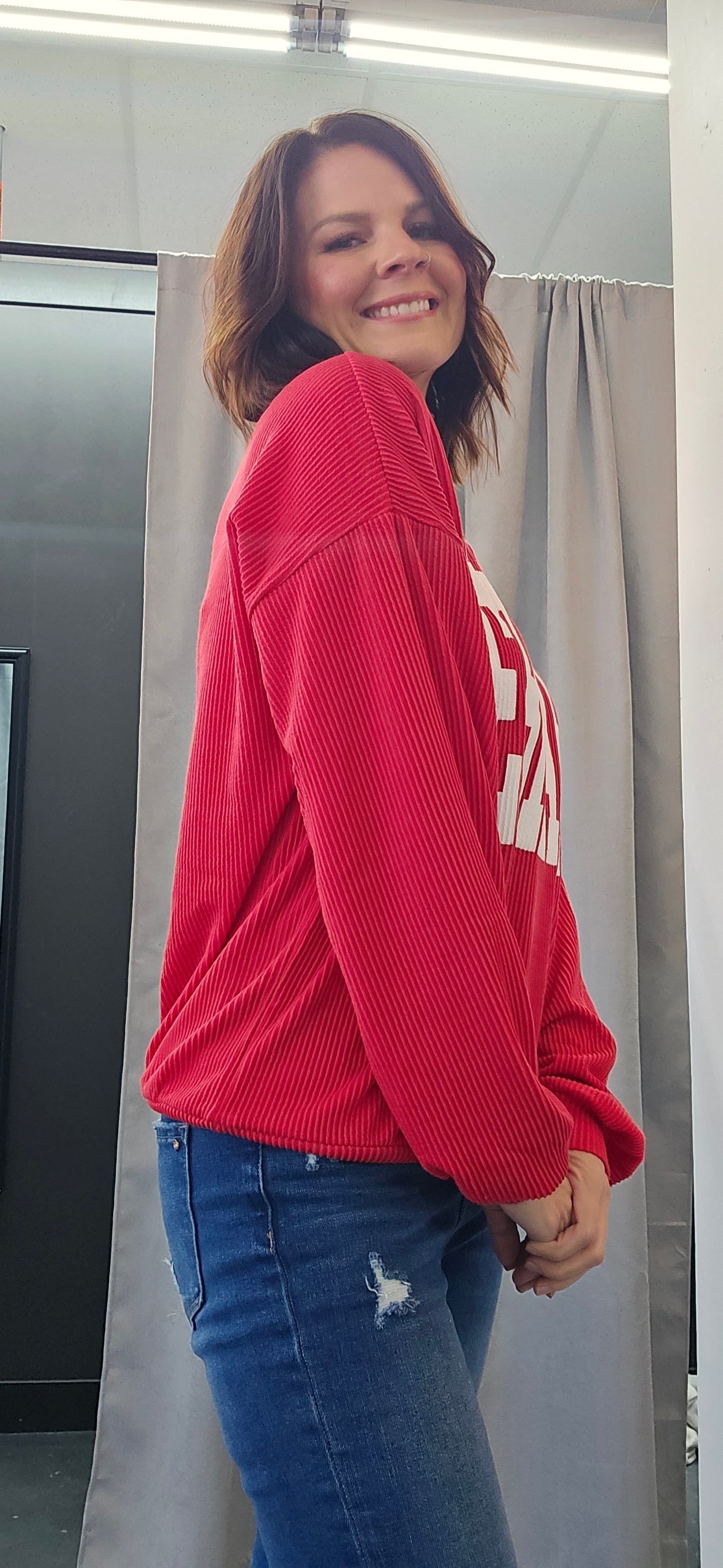 This Ribbed Long Sleeved Crewneck is heavier than a long sleeved T-shirt but, lighter than a traditional sweatshirt