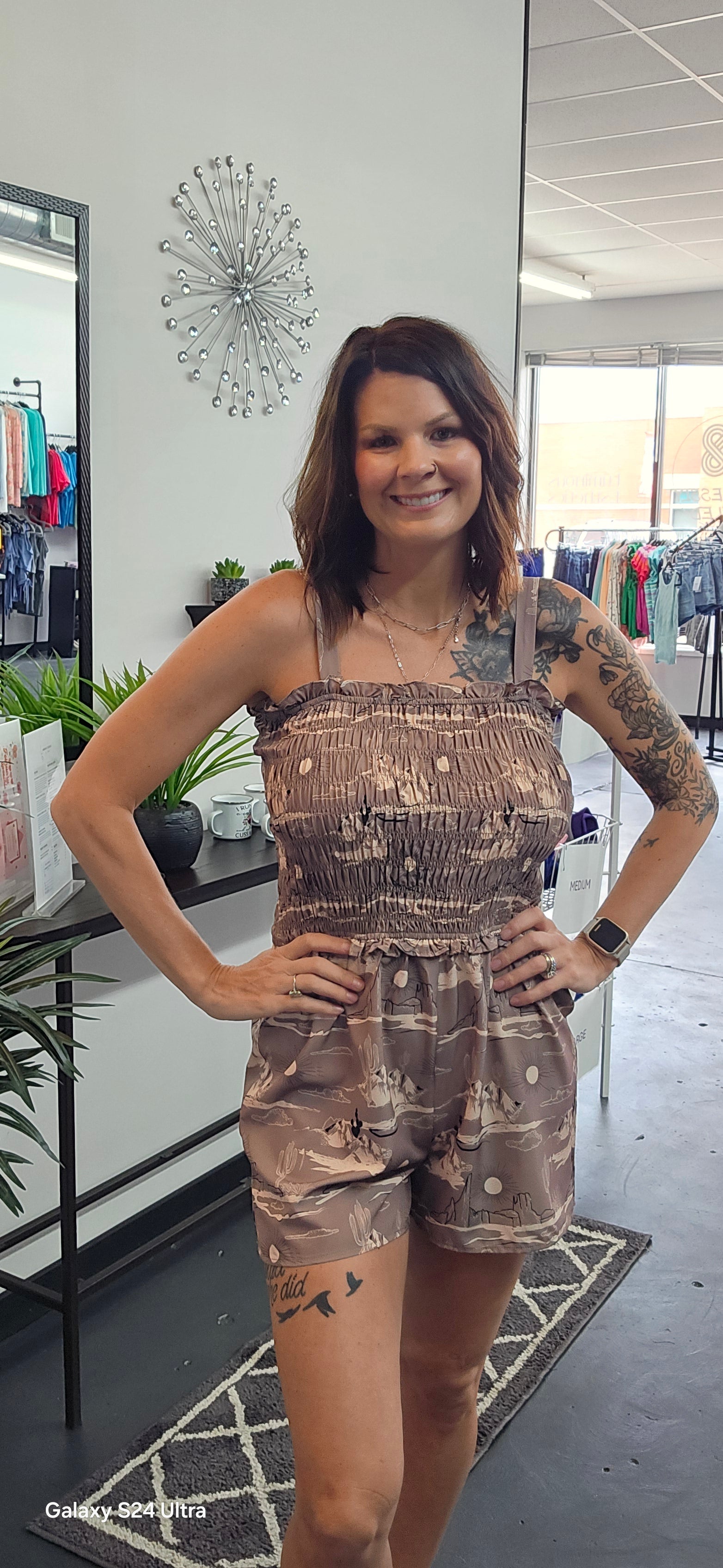 From the expansive desert print to the charming ruffles and fun length, the Remuda Romper offers both style and convenience. With the added bonus of included straps, this adorable dress is perfect for any occasion. Embrace the beauty of nature and elevate your wardrobe with this must-have piece!